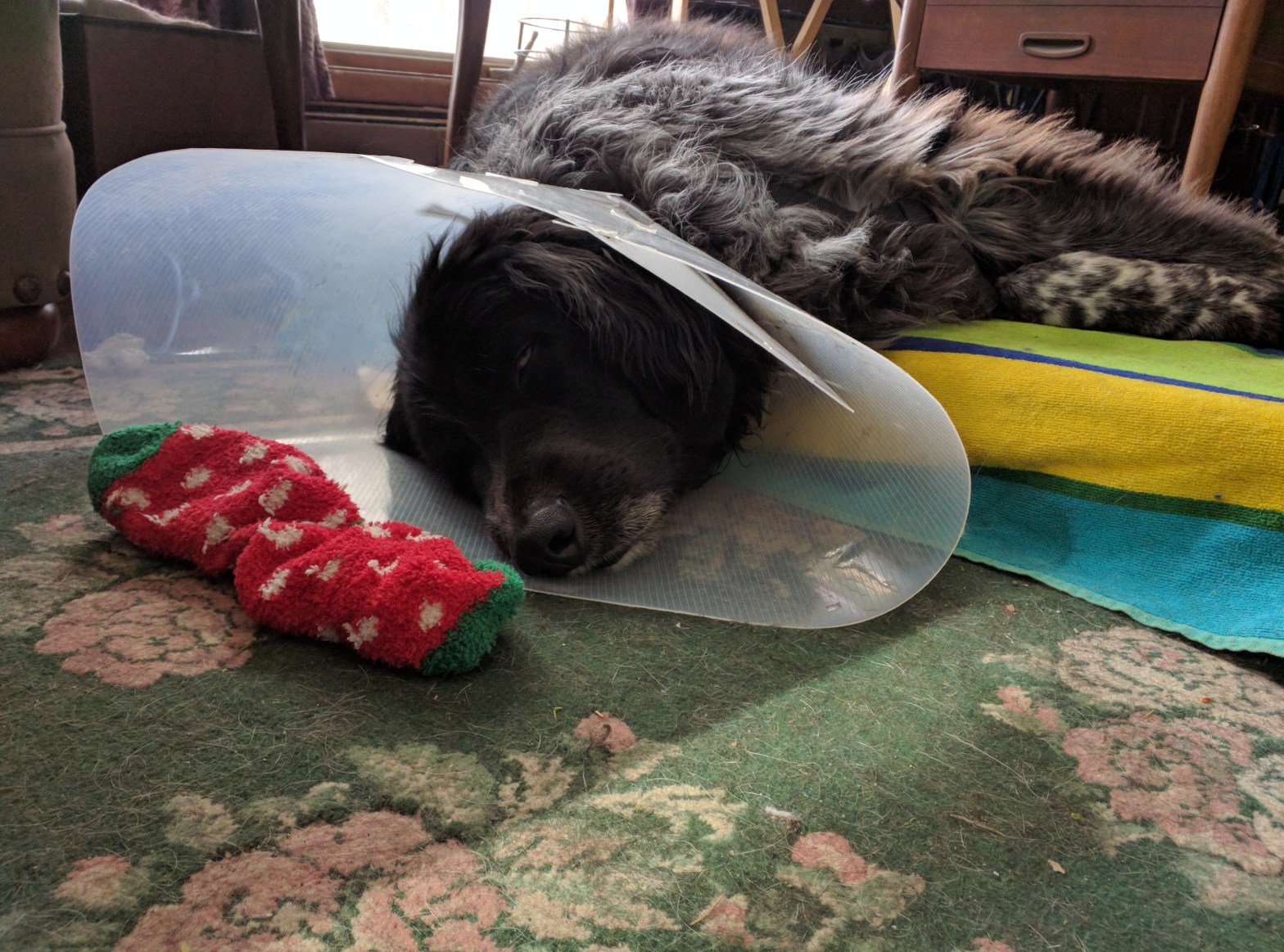 As if to further tease and mock me, Kita, my cousin dog, is now here to visit for a few weeks. She is allowed on furniture. She is allowed to run. She does not need a leash on the property. She had the AUDACITY to pick up my elk antler toy and now the war is on. She will go down. Every time she moves, I will bark. Any time she looks at the couch, I will bark. If she sits on the couch, I will cry like I have never cried before. I will also fling my cone about, dangerously, inflicting pain and damage on any who stand in my way.